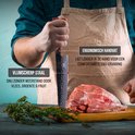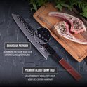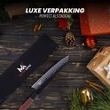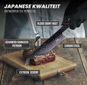 Acier fabriqué à la manière de Damas, avec un manche en bois japonais. En bref : les connaissances de différentes parties du monde ont été appliquées à ce couteau de chef, afin que vous obteniez la meilleure qualité. Le manche ergonomique en bois offre un bon contrôle, confort et maniabilité. De plus, les couteaux de chef japonais sont beaucoup plus légers que ceux d' Europe, par exemple, ce qui signifie que le couteau ressemble plus à une extension de votre bras qu'à un objet lourd que vous tenez. Nous n'entendons rien d'autre que de la positivité à propos de ce trait. Ce couteau de chef japonais est également très dur et donc plus facile à couper.
