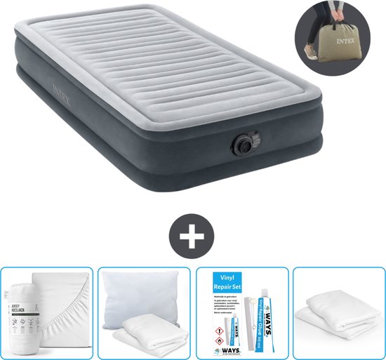 Matelas gonflable Intex - 1 Personne - 99 x 191 x 33 cm - Grijs - Pompe incluse - Hoeslaken - Oreiller - Kit de réparation et protège-oreiller