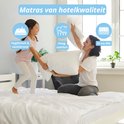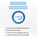La housse du matelas est faite d'un matériau respirant et régulateur d'humidité qui assure une meilleure circulation de l'air et une sensation de fraîcheur. La housse est facile à décompresser et peut être lavée entre 30 et 40 degrés. La housse se compose de deux parties essentielles : une double toile souple et le rembourrage matelassé. Le rembourrage est composé de Climafibre, une fibre polyester creuse qui assure une excellente évacuation de l'humidité et une bonne isolation. De plus, la fibre Clima n'est pas une source de nourriture pour les bactéries. Cela garantit une hygiène optimale