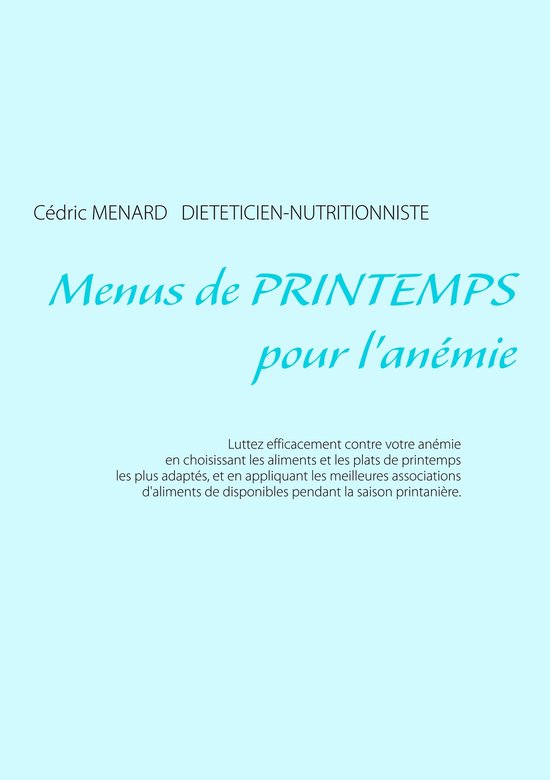 Cet ouvrage est dédié à toutes les personnes souffrant d'anémie, et il offre aux détenteurs des ouvrages du même auteur : " Quelle alimentation pour l'anémie ? " et " Recettes et menus pour l'anémie " un ouvrage parfaitement complémentaire. L'auteur vous propose trois mois de menus spécifiquement adaptés à votre anémie, tous très simples à mettre en pratique grâce à des plats, des légumes et des fruits de printemps vous étant proposés, vous permettant ainsi de mieux adapter votre alimentation à votre pathologie. Un ouvrage diététique de référence pour celles et ceux qui souhaitent corriger leur anémie grâce à leur alimentation !