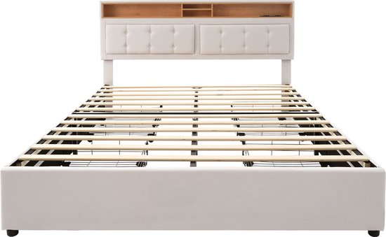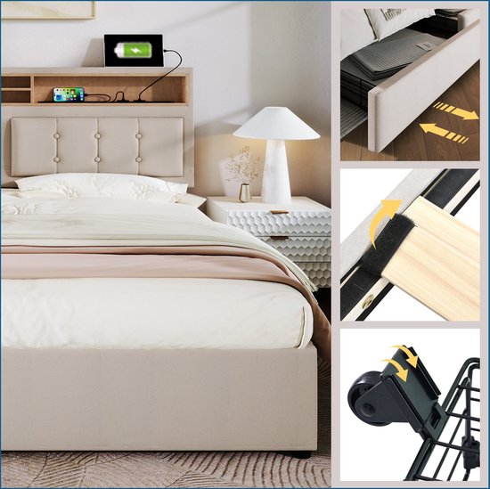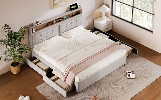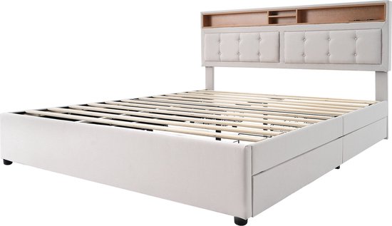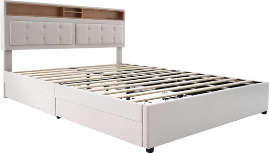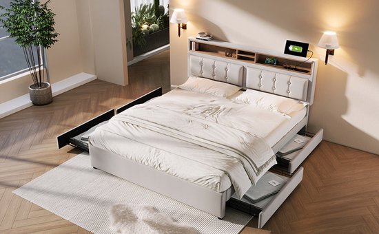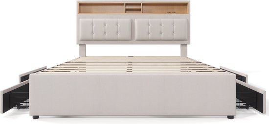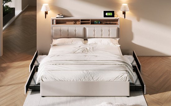 Merax Lit Double Queensize 160x200cm avec 4 Tiroirs de Rangement et Connexion USB-C - Lit Rembourré de Luxe avec Tête de Lit Réglable - Beige