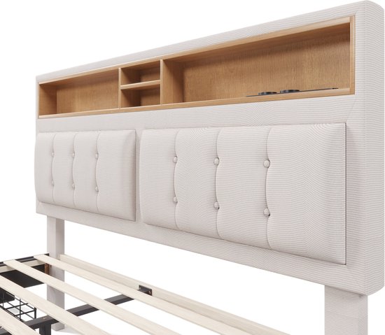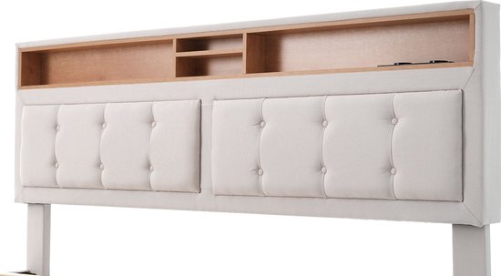 Le lit double Merax 160x200 cm allie confort moderne, espaces de rangement pratiques et technologie innovante. Ce lit rembourré est conçu pour un confort et un style ultimes, avec une tête de lit réglable et des prises USB-C et européennes intégrées. Le cadre de lit est recouvert de lin doux d'une élégante couleur beige, qui donne un aspect luxueux à n'importe quelle chambre.