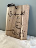 Une planche en bois réconfortante pour remercier quelqu'un de manière douce et personnelle. Fabriqué en bois naturel et fini avec un ruban en cuir élégant pour une suspension ou un placement facile. Le texte « Merci pour tout » est élégamment conçu, accompagné d’une jolie illustration d’un ours serrant un cœur – un détail attachant qui exprime exactement ce que les mots ne parviennent parfois pas à exprimer.