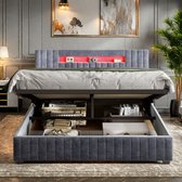 Lit double 140 x 200 cm – Velours Grijs – Lit coffre à ressorts à gaz – Tête de lit Siècle des Lumières par LED – Lit moderne de Luxe avec rangements