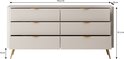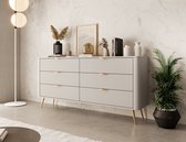 La commode Lima est un meuble de rangement au style hôtel chic. Le buffet repose sur des pieds en métal. Le meuble dispose de 6 tiroirs qui s'ouvrent grâce à des poignées noires. La façade présente un motif à lattes qui donne au meuble un look unique.