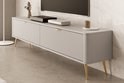 Le Meuble TV Lima est un meuble de rangement sous la TV dans un style hôtel chic. Le meuble TV est de couleur beige avec des pieds dorés. Ces pieds sont en métal.