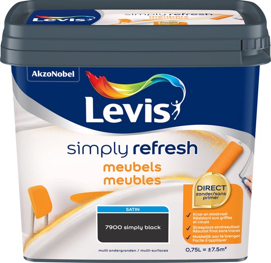 La peinture Simply Refresh de Levis, dans la couleur Simply Black, offre un fini satiné et peut être appliquée directement sur différents types de surfaces, comme le bois, mais peut également être utilisée sur des couches de peinture existantes. La laque est idéale pour la rénovation de meubles dans le salon, la chambre, la cuisine ou la salle de bain.