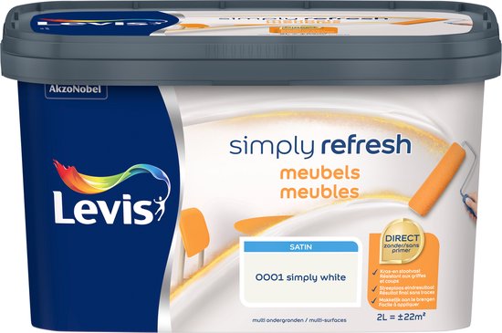 La peinture Simply Refresh de Levis, dans la couleur Simply White, offre un fini satiné et peut être appliquée directement sur différents types de surfaces, comme le bois, mais peut également être utilisée sur des couches de peinture existantes. La laque est idéale pour la rénovation de meubles dans le salon, la chambre, la cuisine ou la salle de bain.
