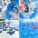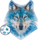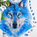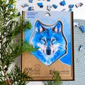Ce puzzle XXL représente le visage d'un loup majestueux, composé de formes nettes et abstraites dans différentes nuances de bleu. Les yeux bleu glacier intenses captent immédiatement l’attention et apportent un sentiment de profondeur et de mystère.