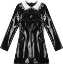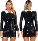 La robe est faite de cuir PU de haute qualité, ce qui lui donne un aspect luxueux et offre une durabilité. Le modèle court, avec manches longues et fermeture éclair au dos, offre une coupe flatteuse et un look séduisant. L'ajout du col en satin donne à la robe un look extra érotique et provocateur.