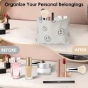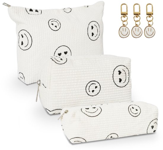 Mon Ninki ® Découvrez la combinaison parfaite de style et de fonctionnalité avec cet ensemble de trousses de maquillage en trois pièces. Cet ensemble comprend trois tailles différentes : grande (20 × 6 × 16,5 cm), moyenne (16 x 7 x 9 cm) et petite (18 x 6 x 6 cm), idéales pour tous vos effets personnels. Les sacs sont fabriqués en velours côtelé de haute qualité, ce qui les rend non seulement doux au toucher, mais également très résistants. La fermeture à glissière garantit que vos affaires restent en sécurité. Ces trousses de maquillage présentent un motif de visage souriant et joyeux, leur donnant un look ludique et tendance. Chacun des trois sacs est livré avec une charmante breloque en métal en forme de visage souriant, constituant un ajout amusant à vos accessoires de tous les jours. L'entretien de ces sacs est simple ; Le matériau en velours côtelé peut être facilement nettoyé avec un chiffon humide. Des produits de nettoyage spéciaux sont disponibles pour les taches tenaces.