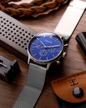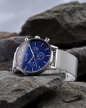 Un chronographe moderne basé sur un design classique. Ce garde-temps a un cadran bleu dans un boîtier de 43 mm. Le bracelet en maille de la montre est en acier inoxydable et est facilement réglable.
