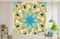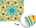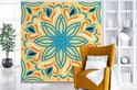 Motif carré sur fond jaune avec une fleur bleue et décorations 260x260 cm