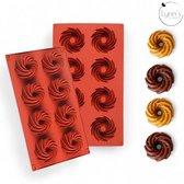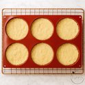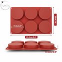 Le moule à pâtisserie est rouge et mesure 22 x 33 centimètres. Les six cavités mesurent 10 centimètres de diamètre et 2,2 centimètres de profondeur.