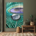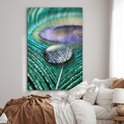 Une vue rapprochée d'une goutte d'eau sur une plume de paon. La plume est une belle turquoise avec un œil bleu et jaune au milieu. Cette image s'intègre parfaitement dans le salon..Spécifications produit
