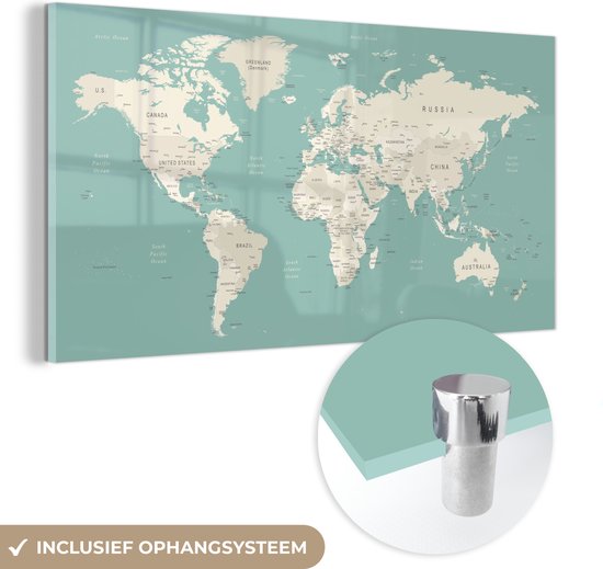 MuchoWow® Peinture sur verre 120x60 cm - Peinture sur verre - Wereldkaart - Blauw - Atlas - Photo sur verre acrylique - Peintures