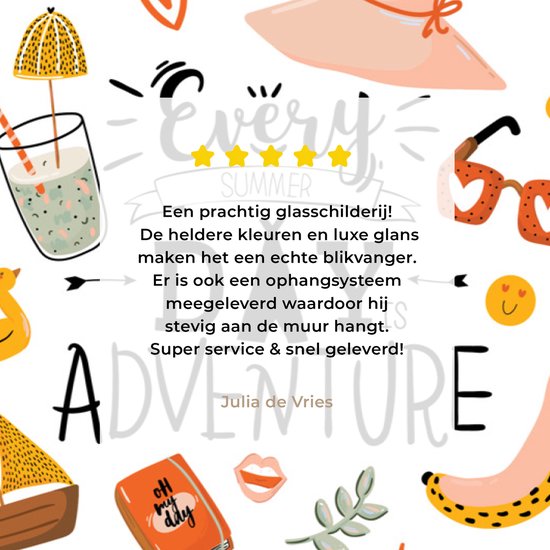Nous visons la perfection dans tout ce que nous faisons et trouvons donc très important que les clients soient satisfaits de leur peinture sur verre ! Ben n'êtes pas satisfait de votre achat ou vous avez des questions et/ou des commentaires ? N'hésitez pas à nous contacter et nous chercherons ensemble une solution adaptée !