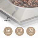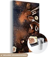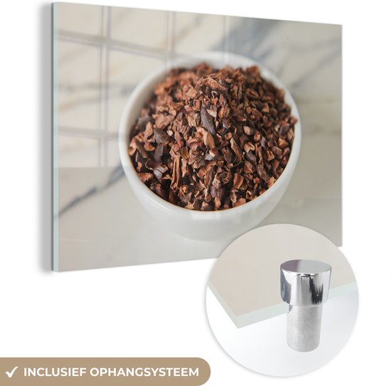 MuchoWow® Peinture sur verre 150x100 cm - Peinture sur verre acrylique - Fèves de cacao moulues dans une tasse en céramique sur une table en marbre - Photo sur verre - Peintures