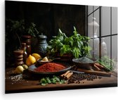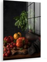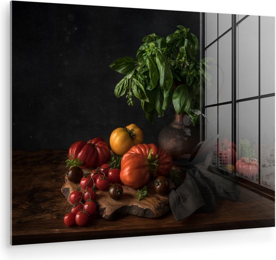 MuchoWow® Peinture sur verre 160x120 cm - Peinture sur verre acrylique - Nature morte - Tomates - Basilic - Tableau - Végétal - Zwart - Photo sur verre - Peintures