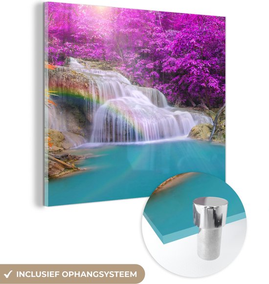 MuchoWow® Peinture sur verre 20x20 cm - Peinture sur verre acrylique - Cascade - Arbres - Arc-en-ciel - Violet - Photo sur verre - Peintures