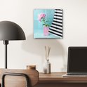 Cette image montre une belle pivoine rose sur un bloc rose. Le fond est en partie bleu clair et en partie rayé noir et blanc.Spécifications produit
