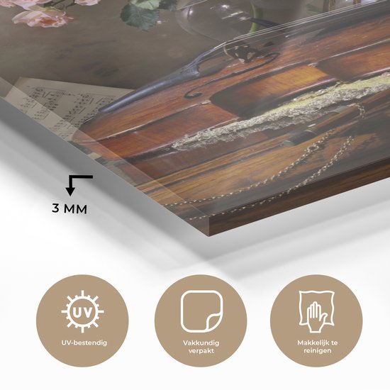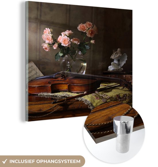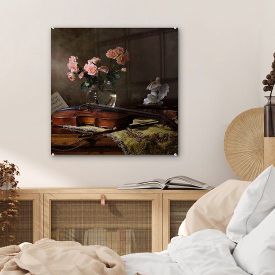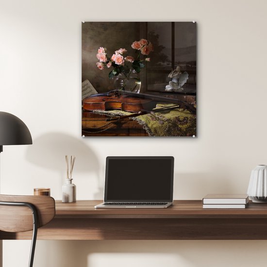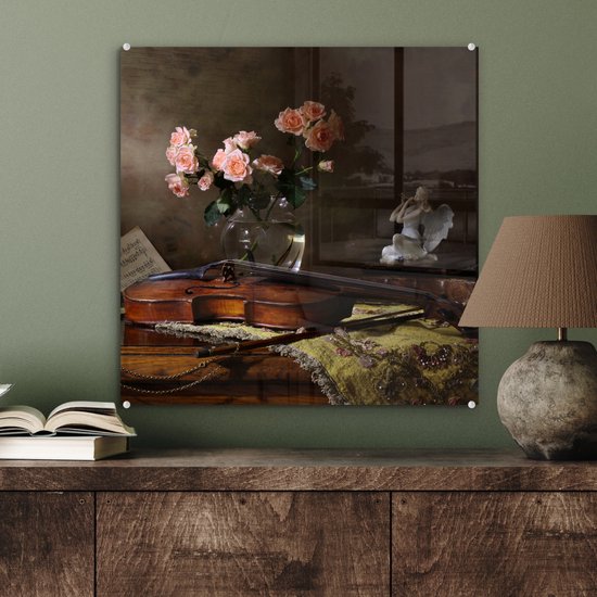 MuchoWow® Peinture sur verre 50x50 cm - Peinture sur verre acrylique - Violon - Roses - Rose - Fleurs - Nature morte - Photo sur verre - Peintures