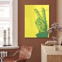 Une œuvre d'art pop art représentant une main levant deux doigts avec une lueur verte dessus.Spécifications produit
