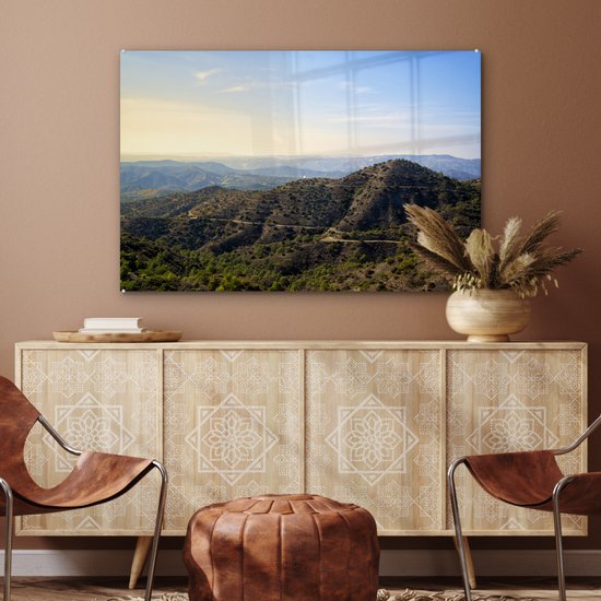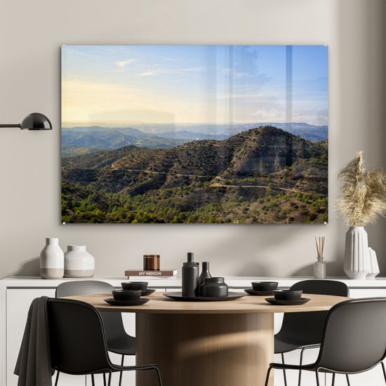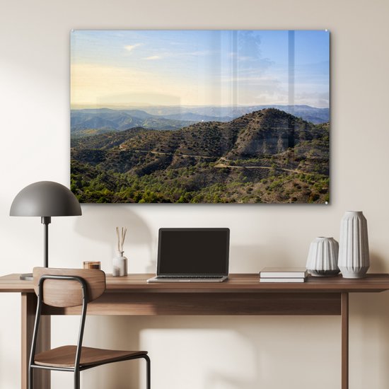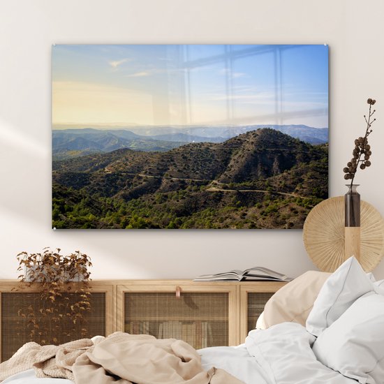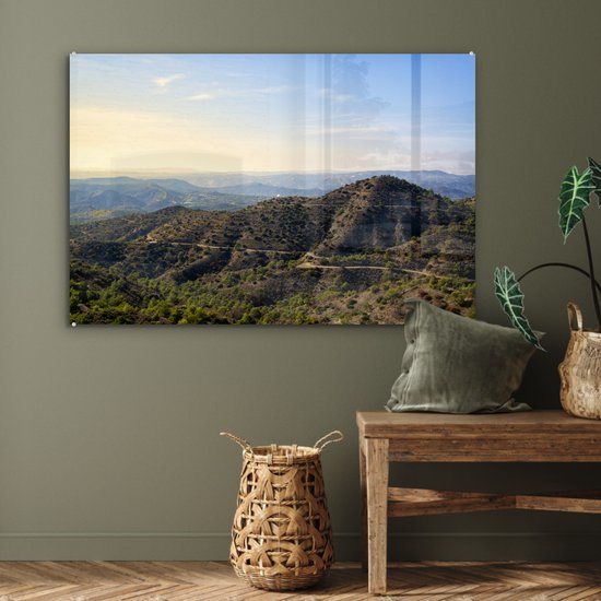 MuchoWow® Peinture sur verre 90x60 cm - Peinture sur verre acrylique - Les montagnes du Trodos à Chypre pendant une journée ensoleillée - Photo sur verre - Peintures