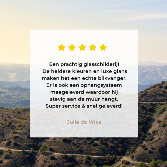 La peinture est en verre acrylique de haute qualité d'une épaisseur totale de 5 mm. De plus, il est doté d'un excellent niveau de finition et il est totalement résistant aux rayons UV, de sorte que les couleurs ne s'estompent pas et que vous puissiez profiter de la peinture sur verre pendant des années.