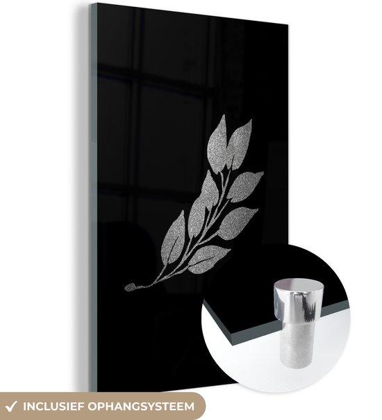 MuchoWow® Peinture sur Verre - Branche avec feuilles allongées sur fond noir - noir et blanc - 100x150 cm - Peintures sur Verre Acrylique - Photo sur Glas