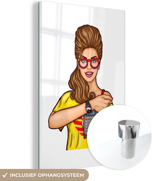 MuchoWow® Peinture sur verre - Femme Pop art avec calculatrice et montre - 60x90 cm - Peintures sur verre acrylique - Photo sur Glas
