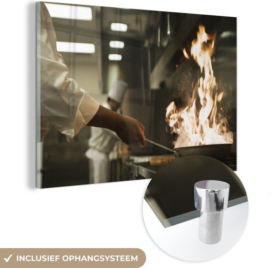 MuchoWow® Peinture sur Verre - Kok tenant une poêle brûlante - 30x20 cm - Peintures sur Verre Acrylique - Photo sur Glas