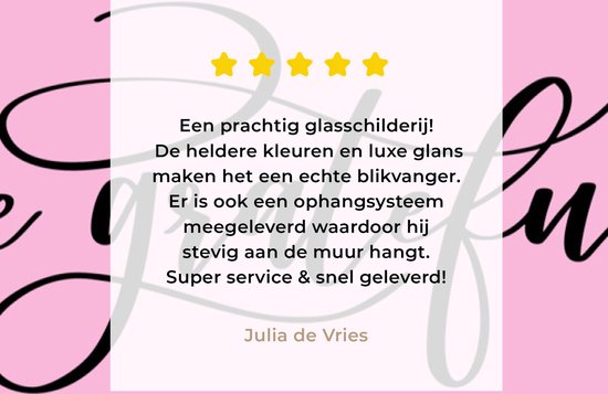 Nous visons la perfection dans tout ce que nous faisons et trouvons donc très important que les clients soient satisfaits de leur peinture sur verre ! Ben n'êtes pas satisfait de votre achat ou vous avez des questions et/ou des commentaires ? N'hésitez pas à nous contacter et nous chercherons ensemble une solution adaptée !