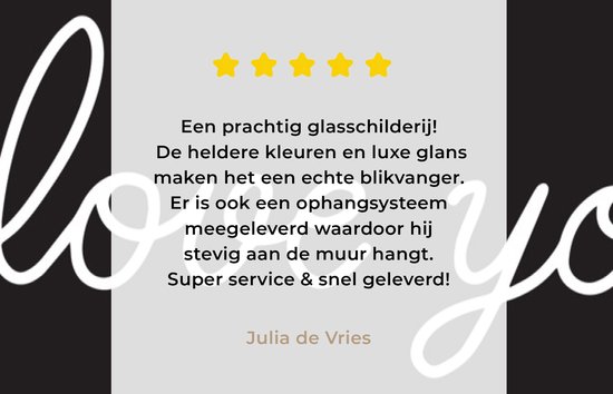 Nous visons la perfection dans tout ce que nous faisons et trouvons donc très important que les clients soient satisfaits de leur peinture sur verre ! Ben n'êtes pas satisfait de votre achat ou vous avez des questions et/ou des commentaires ? N'hésitez pas à nous contacter et nous chercherons ensemble une solution adaptée !