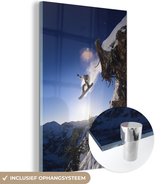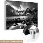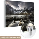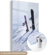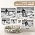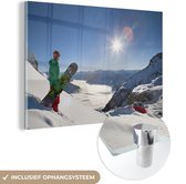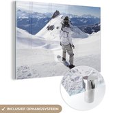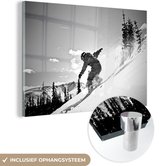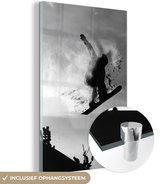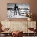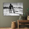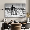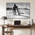 MuchoWow® Peinture sur Verre - Une fille avec un snowboard regarde des montagnes enneigées - noir et blanc - 120x80 cm - Peintures sur Verre Acrylique - Photo sur Glas
