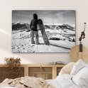 Tableau sur verre - Une fille avec un snowboard regarde des montagnes enneigées - noir et blanc - Salon - Chambre