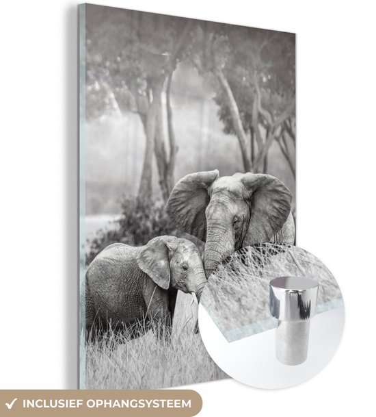 MuchoWow® Tableau en verre 30x40 cm - Peinture sur verre acrylique - Éléphant - Animaux - Nature - Noir et blanc - Photo sur verre - Tableaux