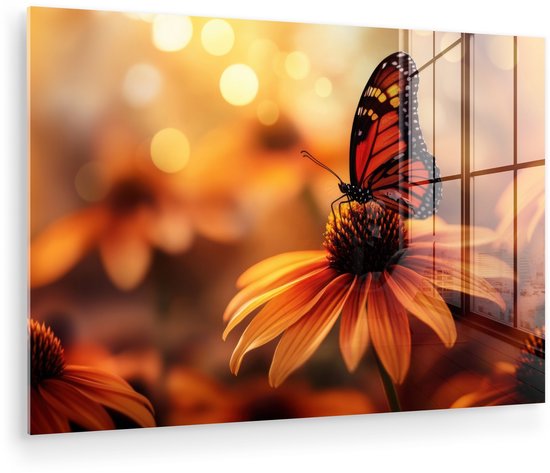 MuchoWow® Tableau sur verre 120x80 cm - Tableau sur verre acrylique - Papillon - Fleurs - Oranje - Photo sur verre - Décoration murale salon - Décoration murale chambre - Peintures