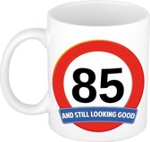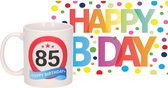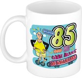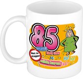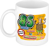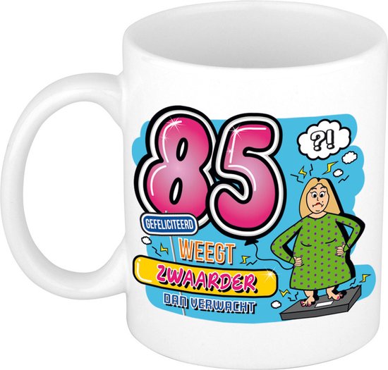 Mug/tasse amusante Bellatio Decorations pour femme. Mug d'anniversaire avec le texte : Félicitations ! 85 pèse plus lourd que prévu. Agréable à offrir en cadeau rempli de bonbons ! La tasse va au micro-ondes et au lave-vaisselle. Matière: céramique. Contenu : environ 300 ml. Hauteur : environ 9,5 cm. Diamètre : environ 8 cm.
