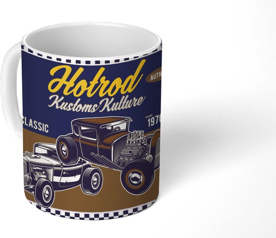 Image rétro de deux voitures. Les lettres jaunes au-dessus des deux véhicules forment le mot « hotrod ». Les petits cadeaux comme cette tasse sont parfaits pour les vacances. Ce cadeau de Noël pour lui ou cadeau de Noël pour elle convient à tout le monde, comme votre père ou votre mère. Alors, êtes-vous toujours à la recherche d'inspiration pour les cadeaux de Noël pour la saison de Noël ? Ne cherchez plus. Nos mugs sont le cadeau parfait pour la Saint-Nicolas et Noël.