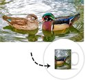 Deux canards nageant avec des plumes colorées.