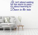Cet autocollant mural a un beau dicton qui vous fait regarder plus positivement les événements de votre vie. Vous n'avez plus besoin d'attendre que la tempête passe, mais apprenez plutôt à danser sous la pluie. Un dicton précieux que vous verrez tous les jours grâce à ce sticker mural. Ce sticker mural est idéal pour décorer un mur nu dans votre maison de manière simple et rapide. Vous pouvez commander l'autocollant mural en différentes couleurs et tailles afin que l'autocollant s'intègre bien au reste de votre intérieur.