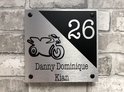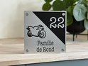 Plaque signalétique avec un moteur réalisé sur une plaque 20x20 cm d'aspect inox avec une impression noire.
