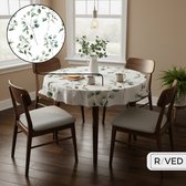 Nappe ronde 140 cm, lavable, lin, coton, beige, nappe infroissable, anti-poussière, avec feuilles vertes brodées, pompons pour cuisine, salle à manger, table à manger, table basse, table de jardin