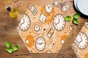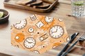 Modèle d'horloges et de sabliers sur fond orange avec engrenages. .