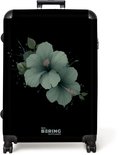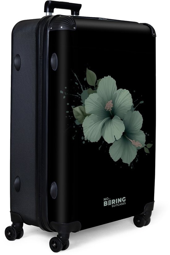 NoBoringSuitcases.com® - Grande valise - Valise de voyage légère - Fond noir avec fleur d'hibiscus verte - Trolley 4 roues - Grand trolley XL - 98 litres de bagages