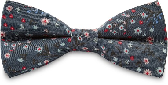 Donnez une touche de charme vintage à votre tenue grâce à ce nœud papillon classique bleu foncé décoré d'un motif floral rose, rouge, noir et bleu.