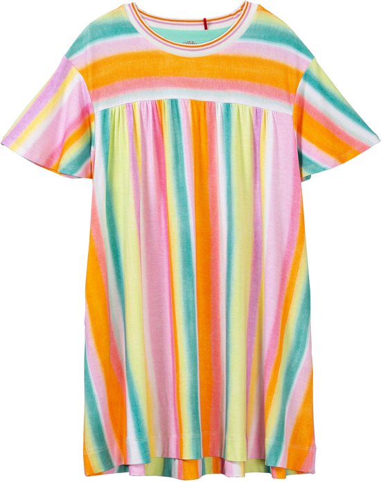 Avec de la peinture aquarelle, nous avons peint des bandes qui se fondent les unes dans les autres pour créer ce motif. Perfect assorti à cette robe d'été au modèle droit et aux manches papillon joyeuses et libres.