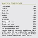 Constituants analytiques: 38% de protéines brutes, de matières grasses brutes 15%, de cendres brutes 8%, 8% de fibres brutes, 12% d'humidité, 1,3% de calcium, 1,1% de phosphore, 2,3% d'oméga-6, d'oméga-3 0 9 % DHA / EPA 0 3% / 0 2%, glucosamine 1400 mg / kg, chondroïtine 1200 mg / kg.