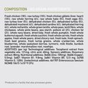 Composition: Viande de poulet fraîche (13%), Œufs entiers frais (7%), Viande de dinde fraîche (7%), Hareng entier frais (7%), Foies de poulet frais (6%), Flet frais du Pacifique (4%), Foie de dinde frais (4) %), rognons de poulet frais (4%), cœurs de poulet frais (4%), cœurs de dinde frais (4%), viande de poulet (séchée, 4%), viande de dinde (séchée, 4%), maquereau entier (séché, 4%), entier sardine (séchée, 4%), hareng entier (séché, 4%), lentilles rouges entières, lentilles vertes entières, pois verts entiers, fibre de lentille, pois chiches entiers, pois jaunes entiers, haricots pluviers entiers, cartilage de poulet (1%), entier haricots blancs, huile de hareng (1%), graisse de poulet (1%), cartilage de dinde (1%), foies de poulet (lyophilisés), foie de dinde (lyophilisé), citrouille fraîche, courge musquée fraîche, courgettes, panais, carottes fraîches, rouge frais délicieux pommes, poires Bartlett fraîches, canneberges fraîches, bleuets frais, baies de Saskatoon, chou vert frais, épinards frais, feuilles de betterave, feuilles de navet, algues brunes séchées, racine de chicorée, curcuma a, chardon-Marie, racine de bardane, lavande, racine de guimauve, églantier.